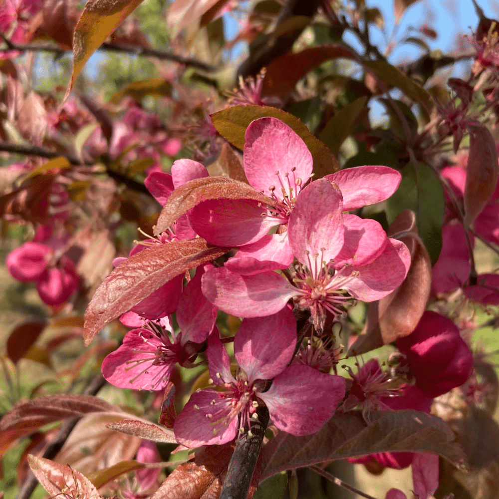 Floraison rouge foncé. Feuillage pourpre.