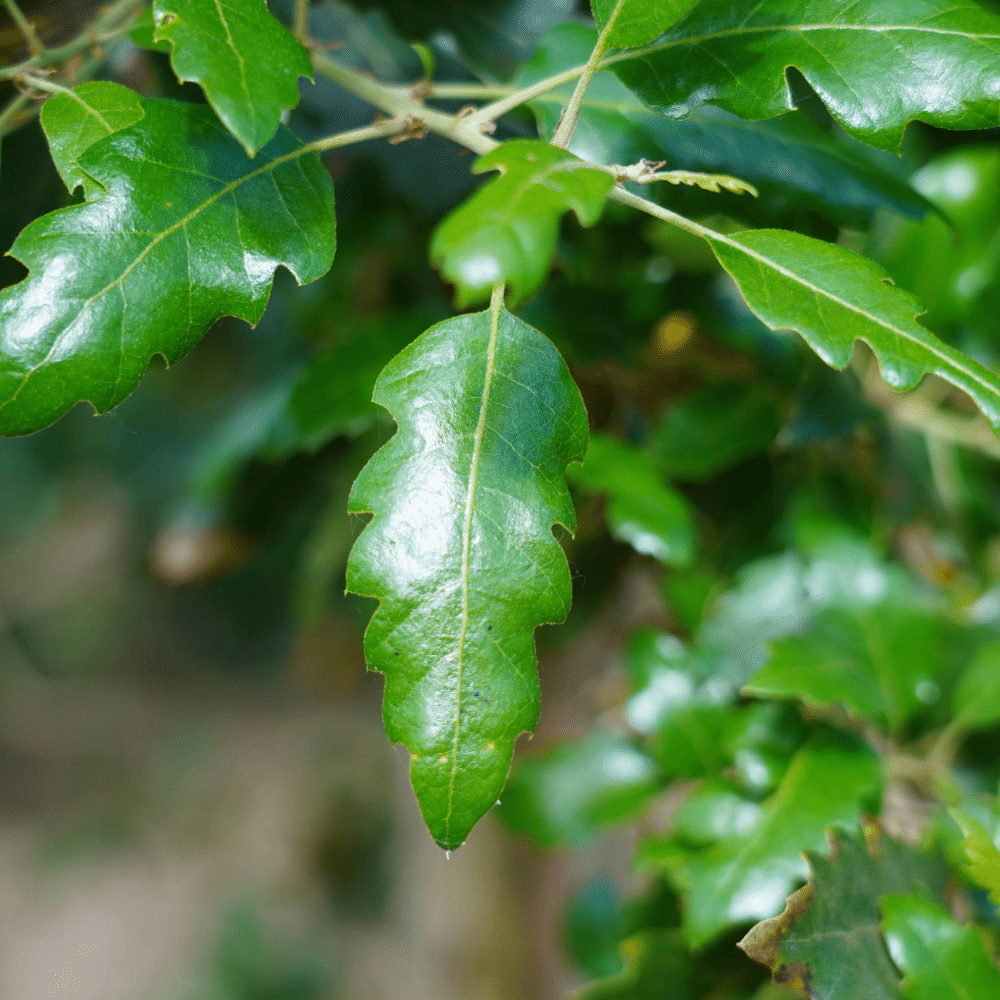 Ecorce liégeuse et grandes feuilles persistantes.